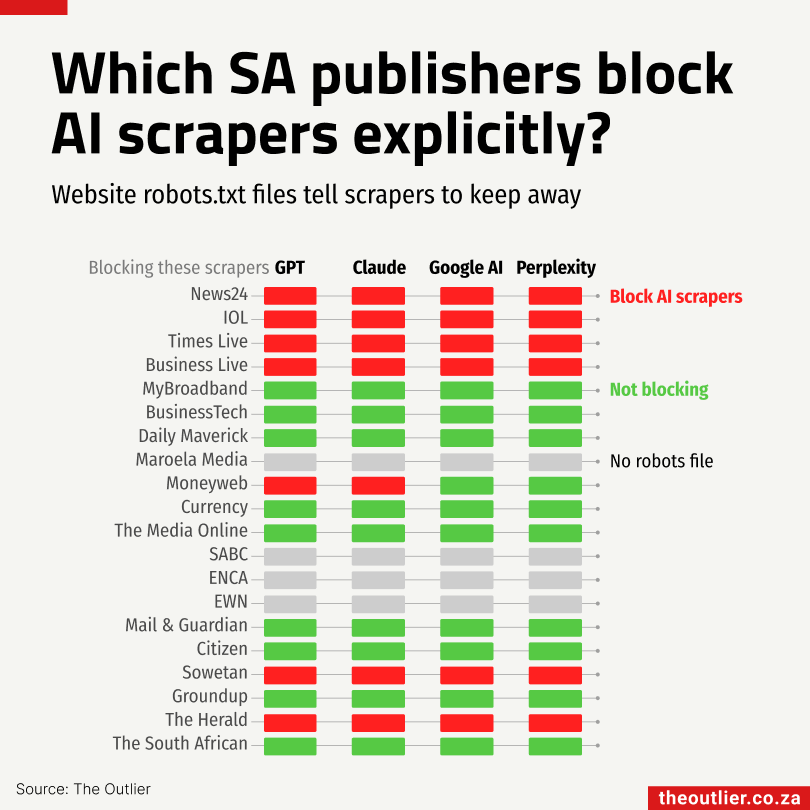 💡 News24, IOL and TimesLIVE now block scrapers from GPT, Claude, Google AI and Perplexity.