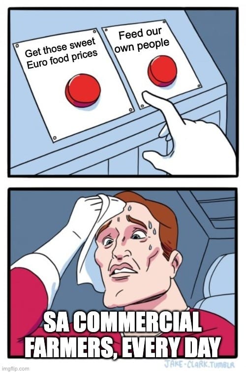 SAβs food setupβs a little weird: We produce R488bnβs worth of food per year, but export 50% of it (especially high-value fruit and veg like citrus, grapes, wine, apples) to chase higher prices overseas and then import R130bnβs rice, wheat, palm oil, cheaper vegetables and poultry to serve our R543bn food & beverage sector.